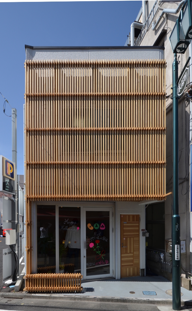 ファサードは一二三を量塊オブジェとしてではなく線材編物としての表情を試みた。