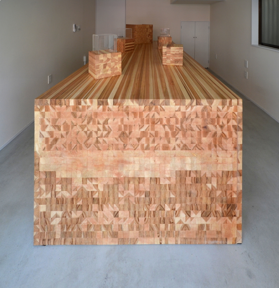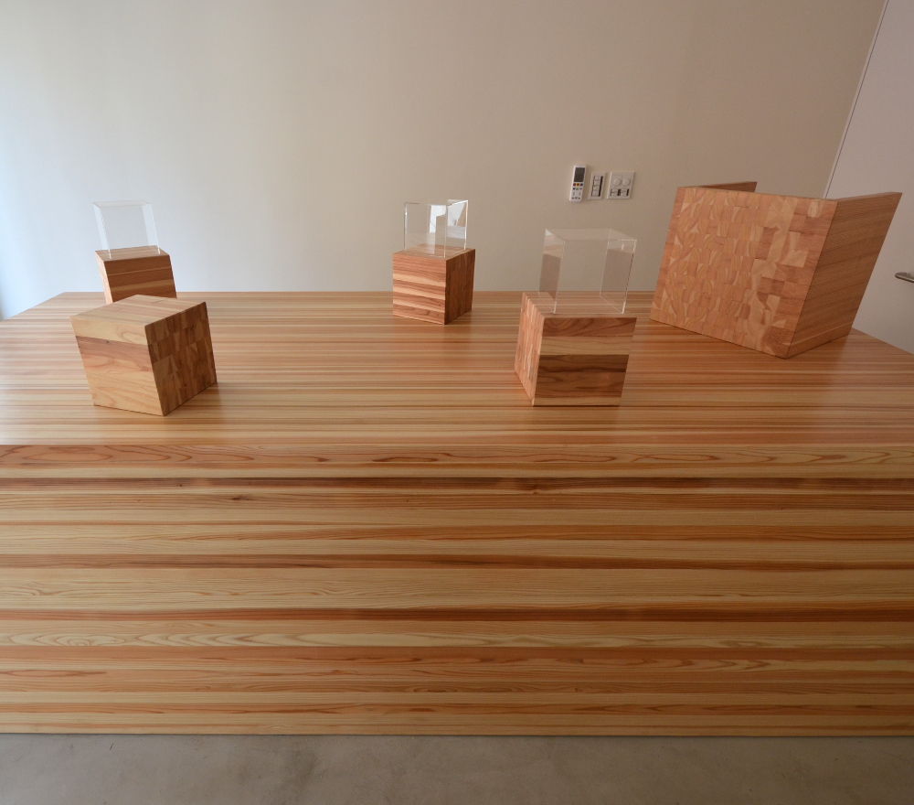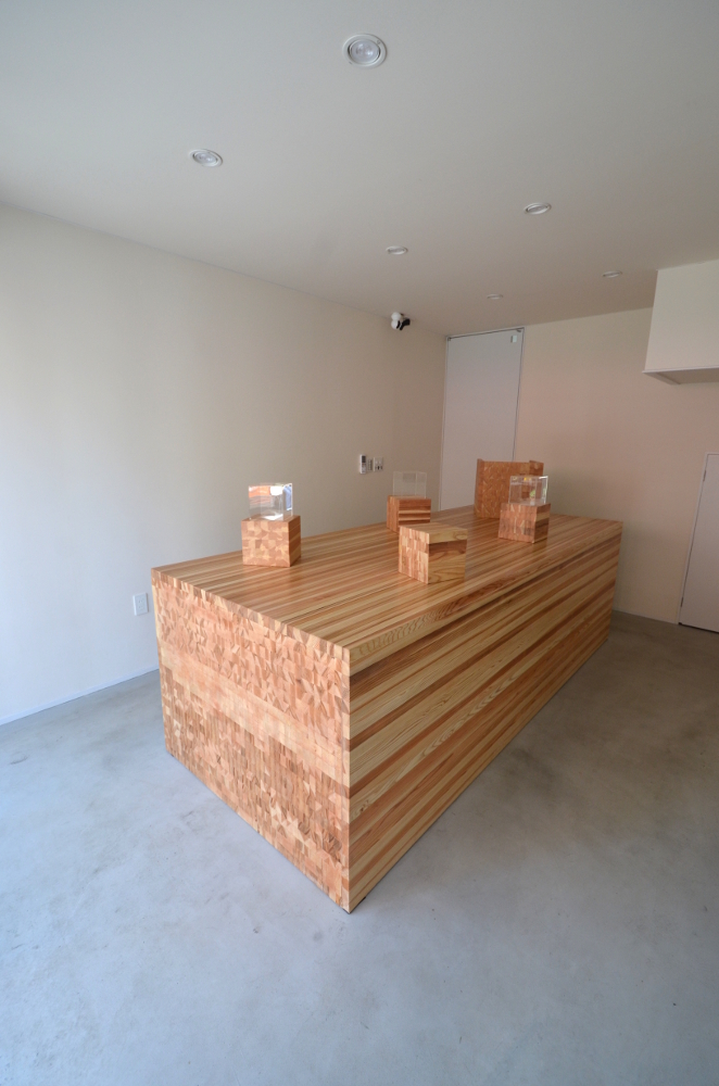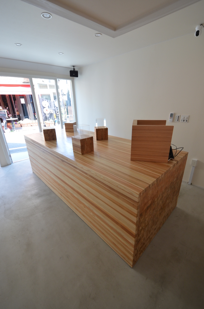 無垢の木として一般に羽柄材として下地等に幅広く使用されるローコスト角材の一二三(いんにっさん:1寸2分×1寸3分断面寸法の角材/現状流通では30mm×40mm断面)を隙間なく束ねてこの塊を構成した。木塊にはコールドテーブルと収納が仕込まれ、商品は断面がアピールポイントでもあるので木塊の断面を表出させそれに呼応させた。