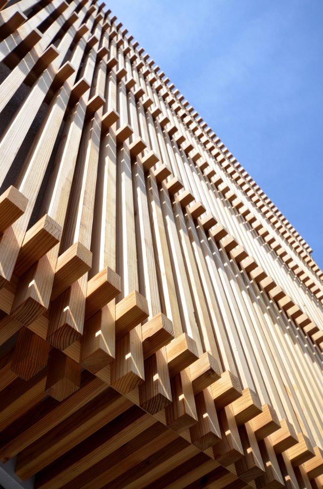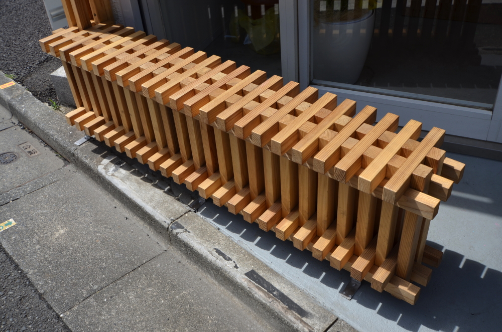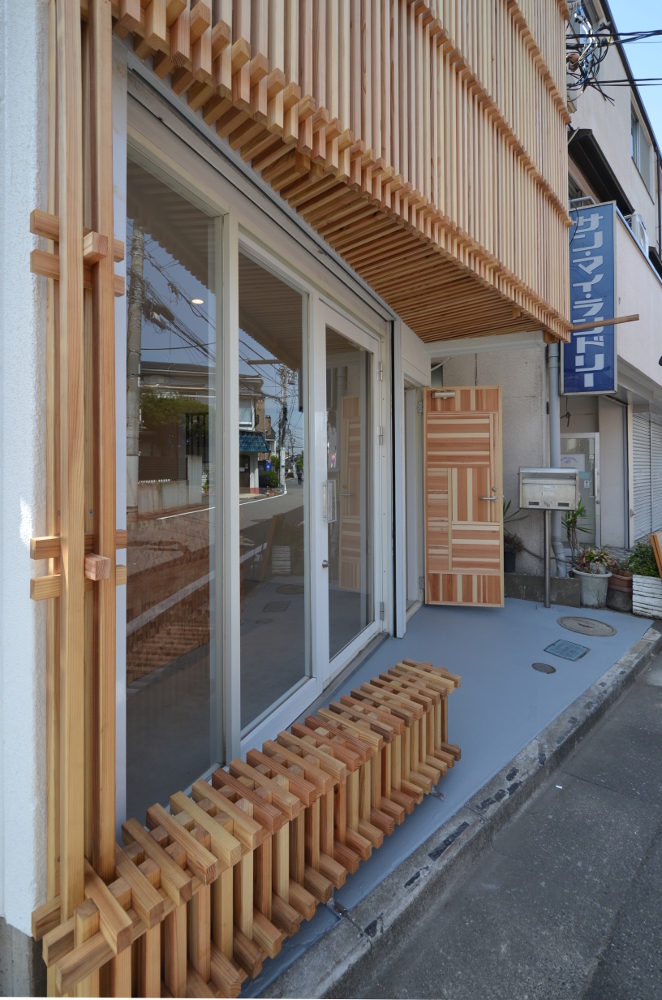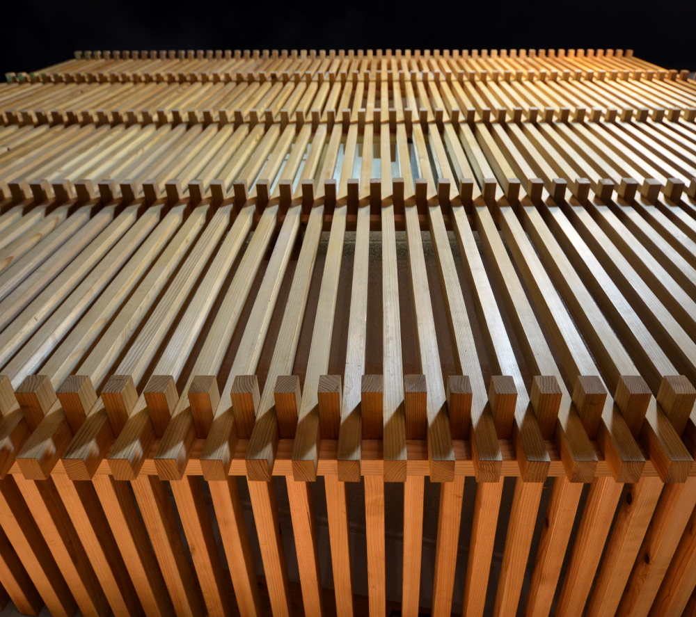 木の編み込みとして組子と指物のエッセンスを引用し、上部と軒は木の縦格子、下部とベンチ・木扉は立体格子・組子として表現し、華奢な寸法ゆえ反りやむくり等生じやすい木材の変形を可能な限り抑制するとともに凛とした佇まいを目指した。