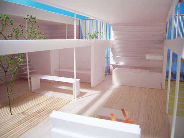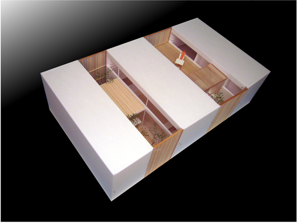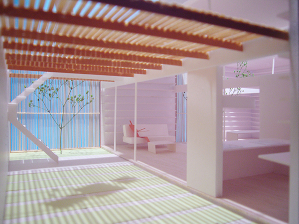 郊外の立地です。 マルチコートハウスという考え方をベースに敷地を目いっぱい無駄なく活用し、平屋と2階建ての両方の良さを併せ持つ1.5階建て(法規上は平屋)、中庭の点在する緑と木の香りがする穏やかな日常構成を提案しました。