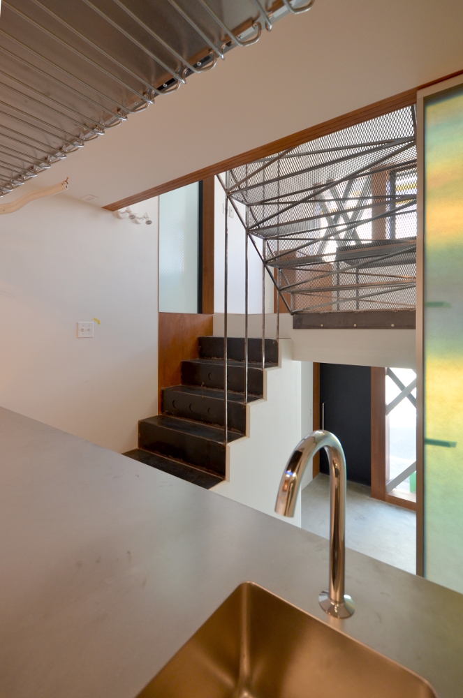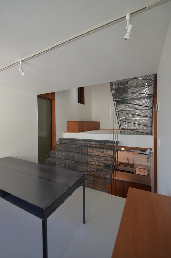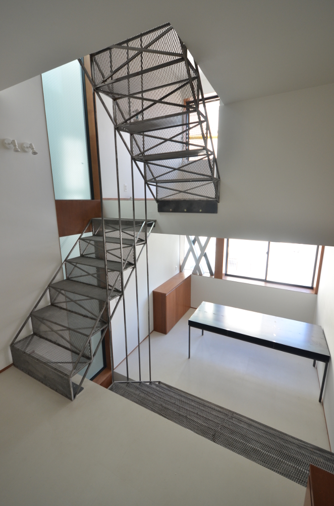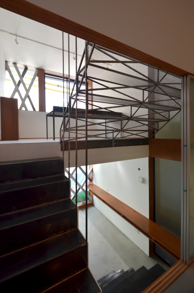 ここでは、要望スペースの関係性を紐解き、隣接可能なスペースの面積を調整しながら半階ずらしつつ縦に並べるスキップフロア構成を採用した。耐火建築が求められる敷地条件だったが地盤が良好でなかったため比較的軽量な耐火木造とし、道路側は間口いっぱいの開口部を各階の必要光量やプライバシーの度合いに合わせて確保し、導いた光や風を建物内にいきわたらせる様にスキップフロアを構成する階段を透過性のあるメッシュ階段とした。またその階段は上下階の移動手段であると同時に床同士をつなぐ構造体であり、階段の幅に変化をつけ大階段や飾り棚としても機能させた。
