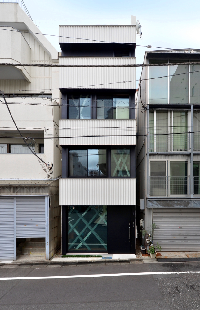 外装は白の大波鋼板を開口部の部分を間口いっぱいに黒の鋼板で欠き取った表情とし縦に伸びるファサードにストライプのリズムを設けている。内装は明るく光が回るように床壁天井を白もしくはライトグレーの素材感のないニュートラルな背景とし、家具や建具とその枠をナチュラルな木仕上げ、階段やキッチン廻りはハードな金属、間仕切りは手わざの残るFRPクリア板として素材感を取り入れた。