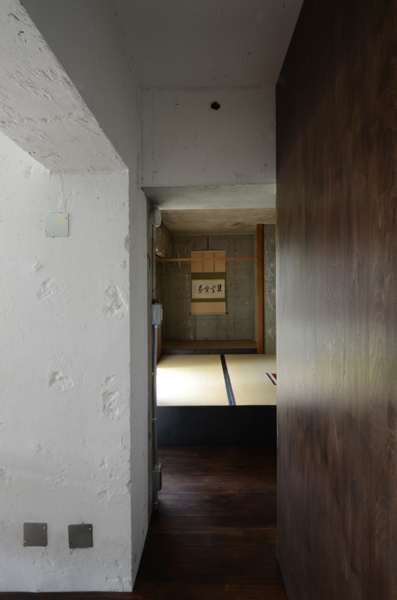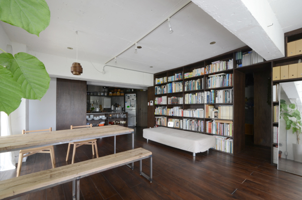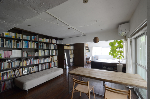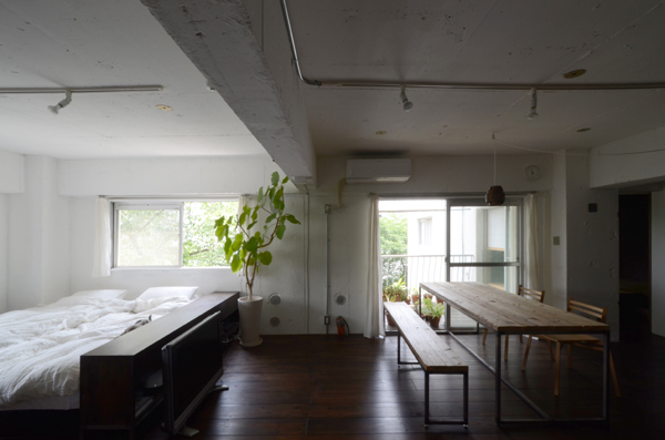 築37年のレトロモダンな集合住宅一室のリフォームです。 ここでは、解体後の既存躯体を活かしつつ、下地材や仮設材といった一般加工前の「気取らない素材」を選び、白とダークブラウンに染色することで普段の日常を落ち着いてくつろぐげる雰囲気に醸しだしました。
