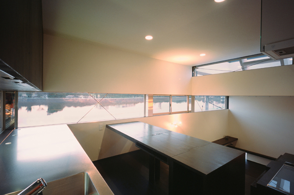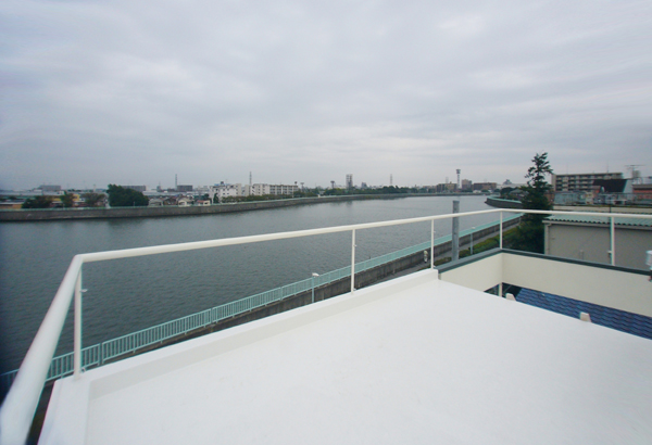 ら植栽帯と空、ダイニングから中川、屋上から空と